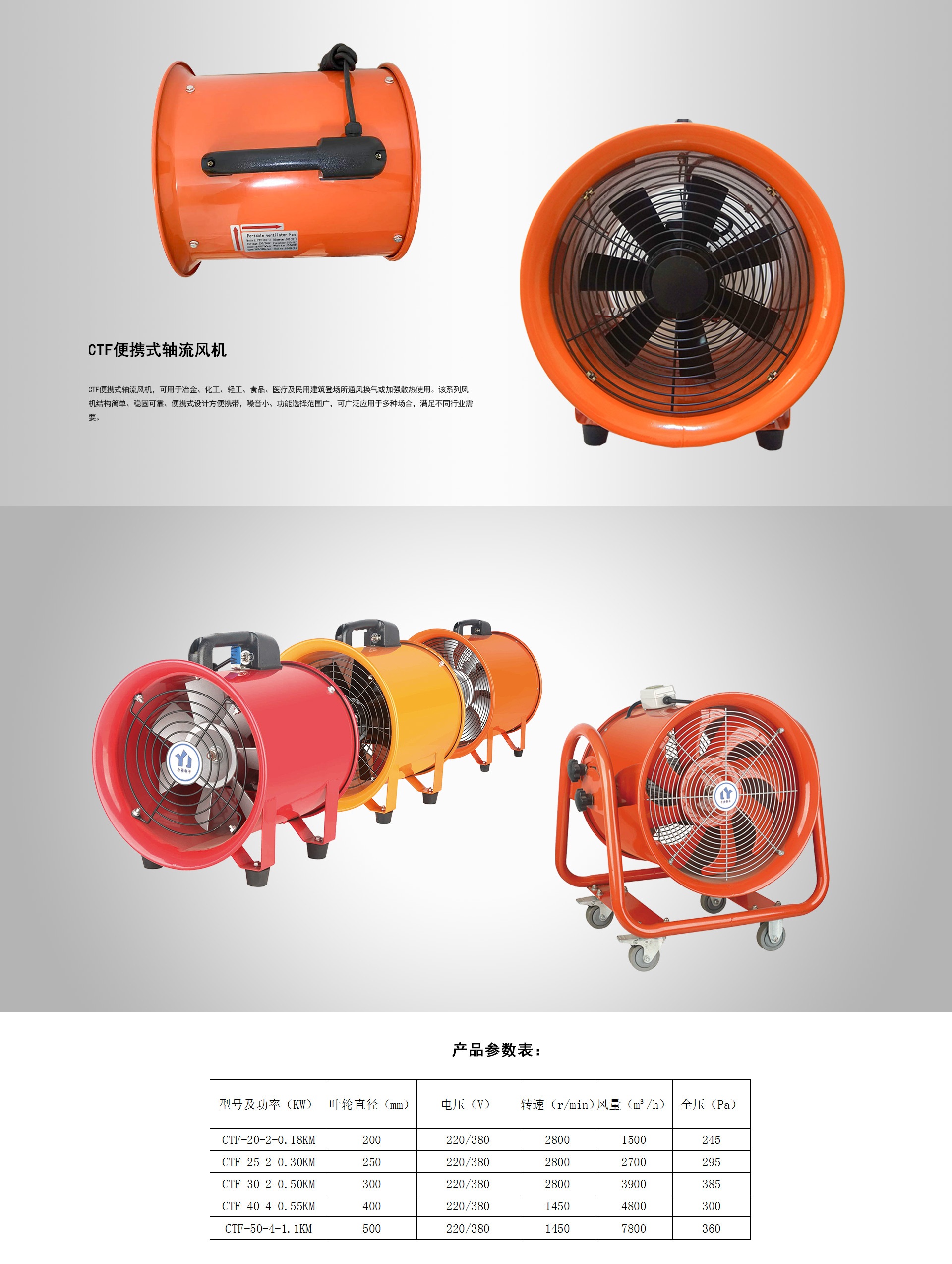 ? ? ? ? ?CTF便攜式軸流風(fēng)機(jī),可用于冶金、化工、輕工、食品、醫(yī)療及民用建筑登場(chǎng)所通風(fēng)換氣或加強(qiáng)散熱使用。該系列風(fēng)機(jī)結(jié)構(gòu)簡(jiǎn)單、穩(wěn)固可靠、便攜式設(shè)計(jì)方便攜帶,噪音小、功能選擇范圍廣,可廣泛應(yīng)用于多種場(chǎng)合,滿足不同行業(yè)需要。